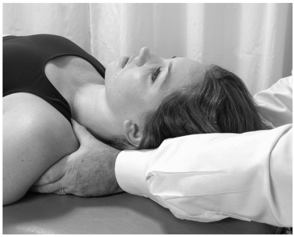 Tracción anterolateral en los tejidos blandos cervicales con rotación simultánea de la cabeza del paciente.