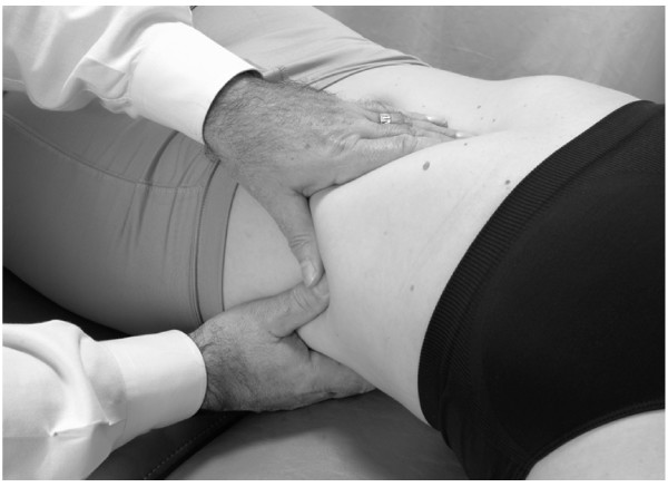 1. El médico alcanza con su mano izquierda debajo del paciente para agarrar el ángulo de la octava costilla disfuncional y aplica tracción en dirección inferolateral.